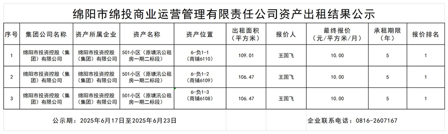 綿陽市綿投商業(yè)運營管理有限責(zé)任公司資產(chǎn)出租結(jié)果公示