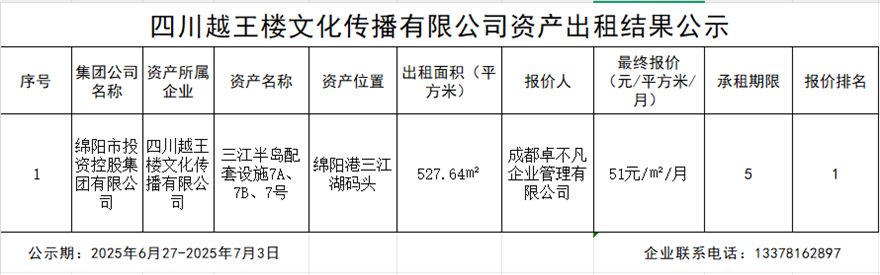 四川越王樓文化傳播有限公司資產(chǎn)出租結(jié)果公示