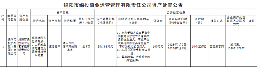 綿陽市綿投商業(yè)運(yùn)營管理有限責(zé)任公司資產(chǎn)處置公告