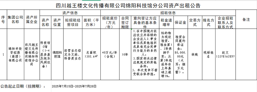 四川越王樓文化傳播有限公司資產(chǎn)出租公告