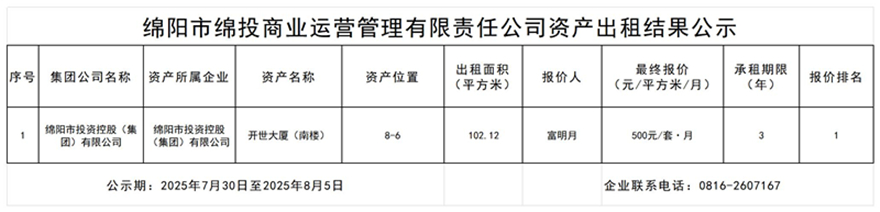 綿陽市綿投商業(yè)運營管理有限責任公司資產(chǎn)出租結(jié)果公示