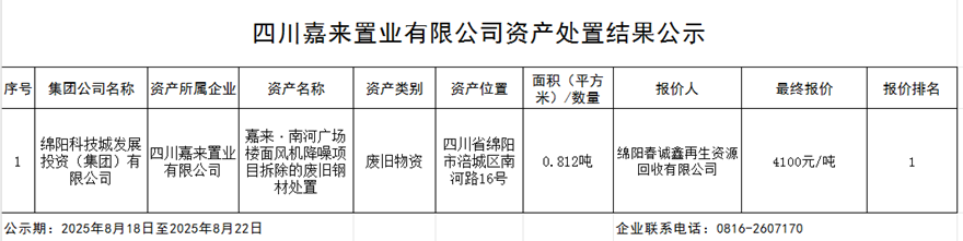 四川嘉來置業(yè)有限公司資產(chǎn)處置結(jié)果公示
