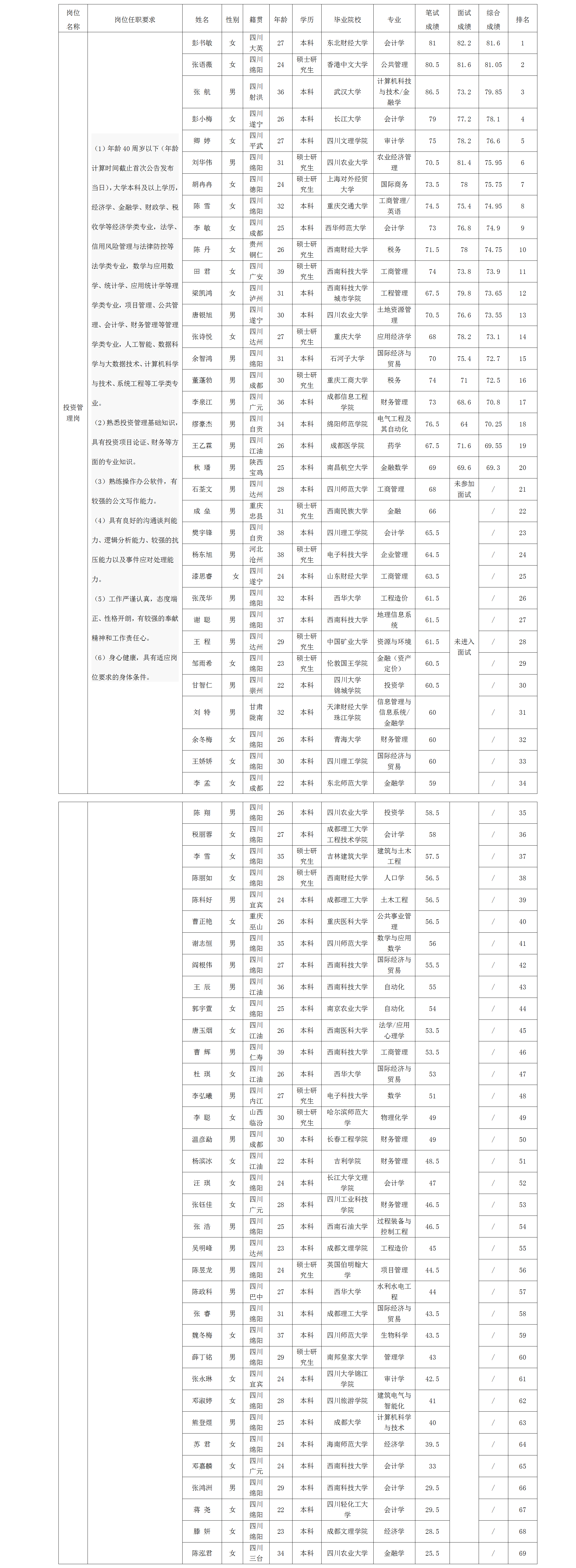 根據(jù)綿陽市投資控股(集團(tuán))有限公司發(fā)布的招聘公告及招聘相關(guān)規(guī)定,經(jīng)筆試、面試等程序,現(xiàn)將筆試(面試)成績予以公示。