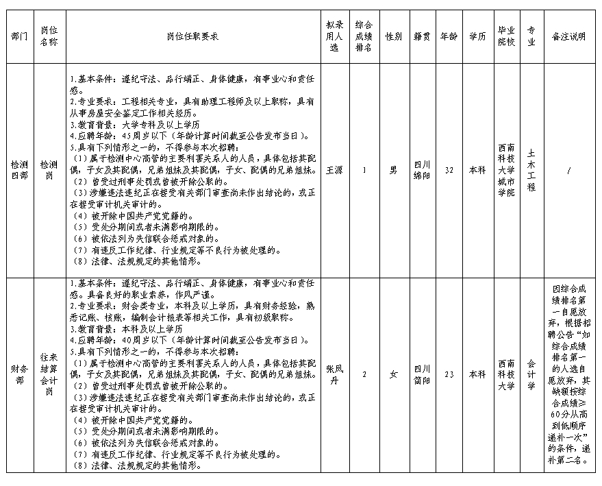 根據(jù)綿陽市建設工程質(zhì)量檢測中心有限責任公司發(fā)布的招聘公告及招聘相關規(guī)定,經(jīng)筆試、面試、背景調(diào)查、體檢等程序,擬錄用王源等同志到綿陽市建設工程質(zhì)量檢測中心有限責任公司工作,現(xiàn)予以公示,具體情況如下: