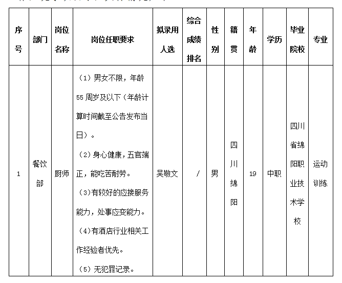 根據(jù)綿陽市東津酒店管理有限責(zé)任公司發(fā)布的招聘公告及招聘相關(guān)規(guī)定,通過面試等程序,擬錄用吳敬文同志到餐飲部工作,現(xiàn)予以公示,具體情況如下: