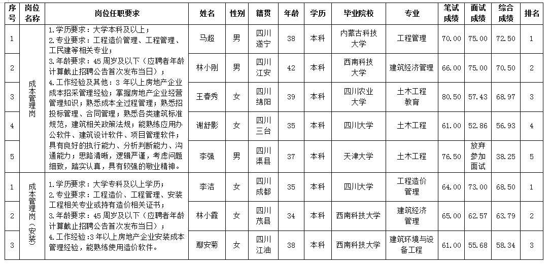 根據(jù)綿陽(yáng)市綿投置地有限公司發(fā)布的招聘公告及招聘相關(guān)規(guī)定,經(jīng)筆試、面試等程序,現(xiàn)將筆試、面試成績(jī)予以公示。
