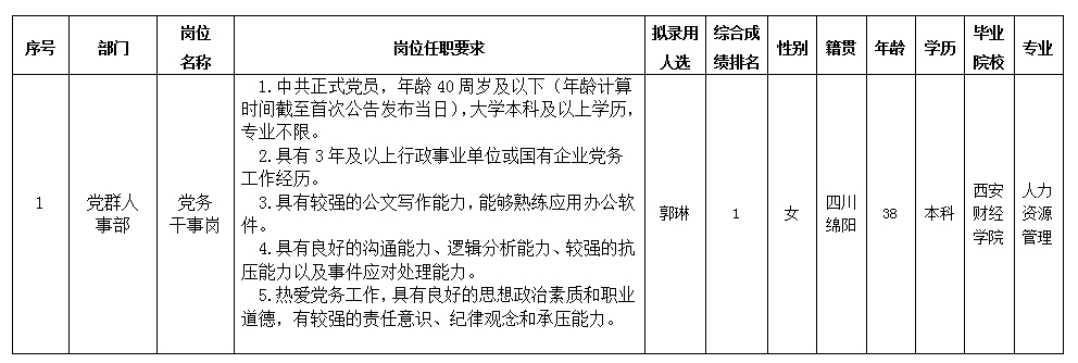 根據(jù)綿陽市投資控股(集團(tuán))有限公司發(fā)布的招聘公告及招聘相關(guān)規(guī)定,經(jīng)筆試、面試、考察、體檢等程序,擬錄用郭琳同志到綿陽市投資控股(集團(tuán))有限公司工作,現(xiàn)予以公示,具體情況如下: