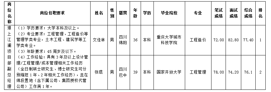 根據(jù)綿陽市綿投置地有限公司發(fā)布的招聘公告及招聘相關(guān)規(guī)定,經(jīng)筆試、面試等程序,現(xiàn)將筆試、面試成績予以公示。