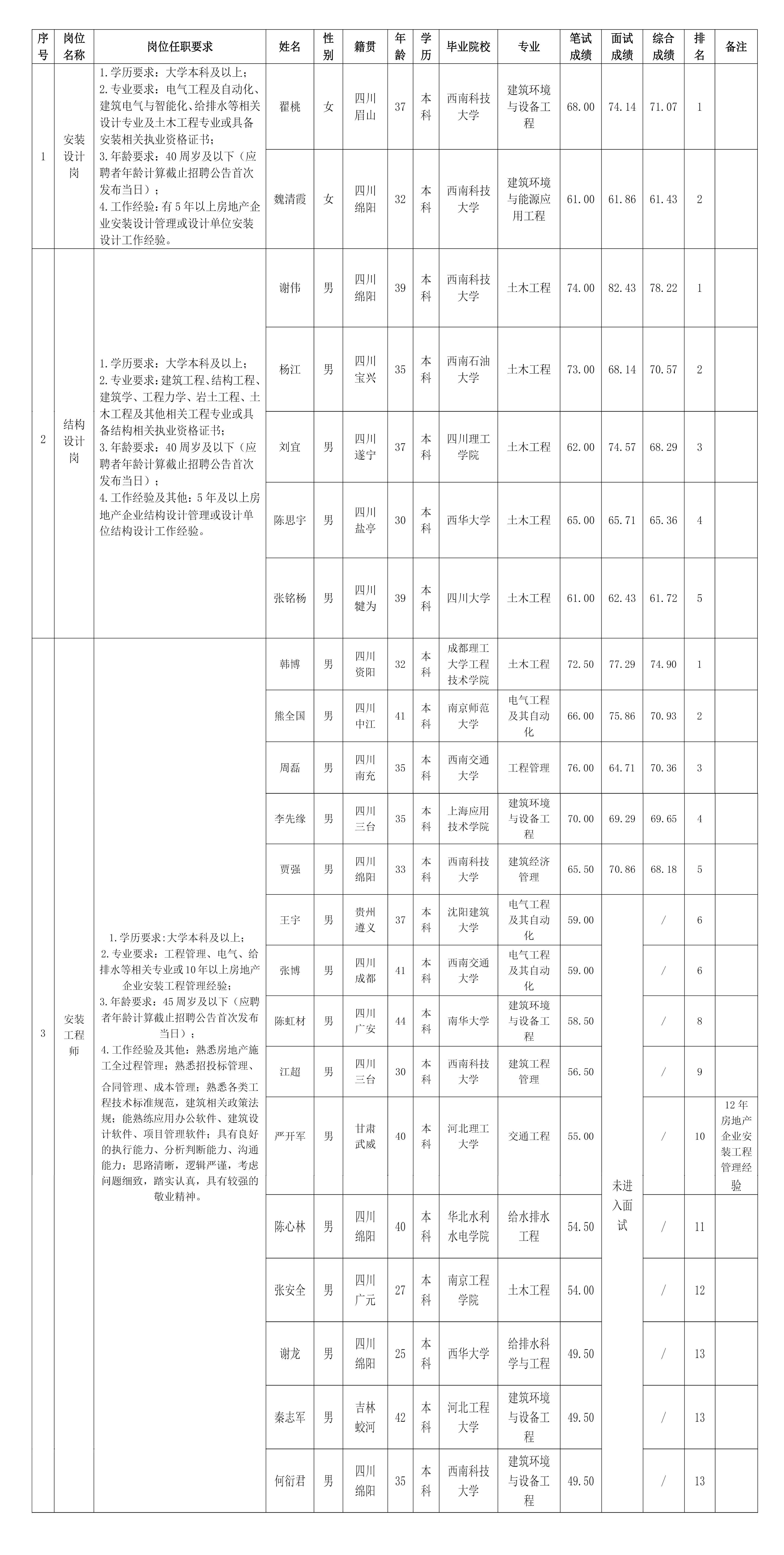 根據(jù)綿陽市綿投置地有限公司發(fā)布的招聘公告及招聘相關(guān)規(guī)定,經(jīng)筆試、面試等程序,現(xiàn)將筆試面試成績予以公示。
