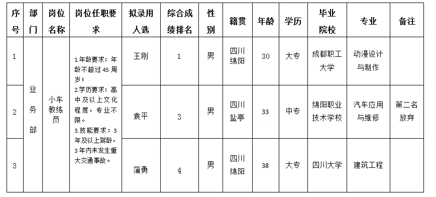 根據(jù)綿陽市汽車實(shí)驗駕駛技術(shù)學(xué)校股份有限公司發(fā)布的招聘公告及招聘相關(guān)規(guī)定,經(jīng)實(shí)操、面試、考察、體檢等程序,擬錄用王剛等3位同志到綿陽市汽車實(shí)驗駕駛技術(shù)學(xué)校股份有限公司工作,現(xiàn)予以公示,具體情況如下: