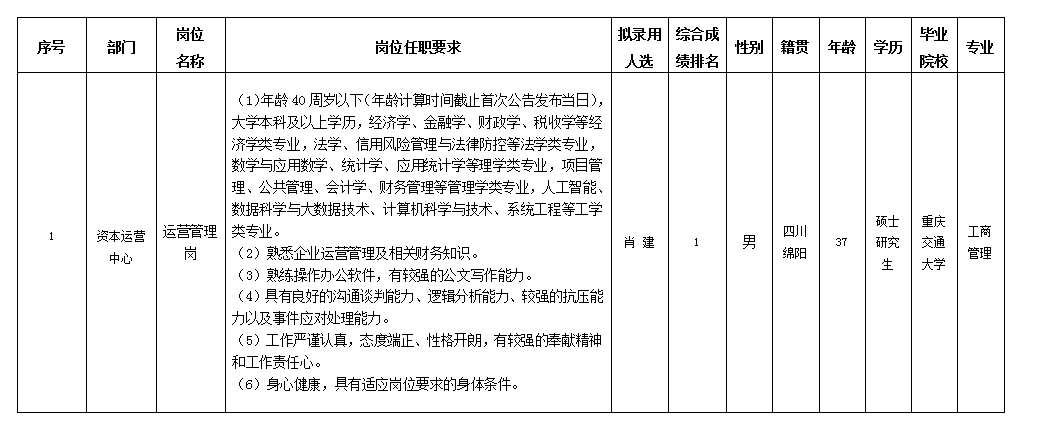 根據(jù)綿陽(yáng)市投資控股(集團(tuán))有限公司發(fā)布的招聘公告及招聘相關(guān)規(guī)定,經(jīng)筆試、面試、考察、體檢等程序,擬錄用肖建同志到綿陽(yáng)市投資控股(集團(tuán))有限公司工作,現(xiàn)予以公示,具體情況如下: