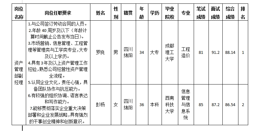 根據(jù)綿陽市綿投商業(yè)運(yùn)營管理有限責(zé)任公司發(fā)布的競(jìng)聘公告及競(jìng)聘相關(guān)規(guī)定,經(jīng)筆試、面試等程序,現(xiàn)將筆試(面試)成績予以公示。