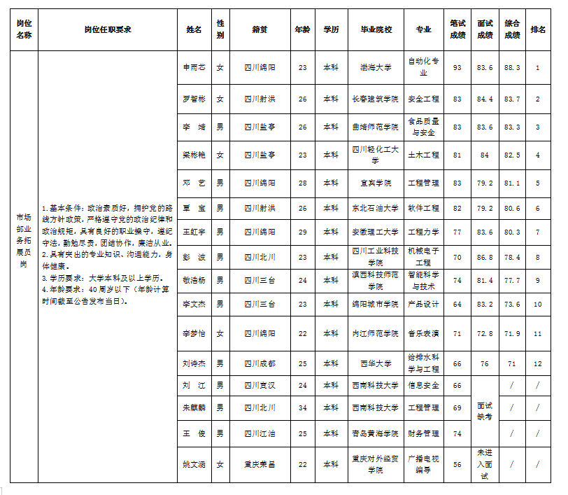 根據(jù)綿陽市建設工程質(zhì)量檢測中心有限責任公司發(fā)布的招聘公告及招聘相關(guān)規(guī)定,現(xiàn)將筆試(面試)成績予以公示。