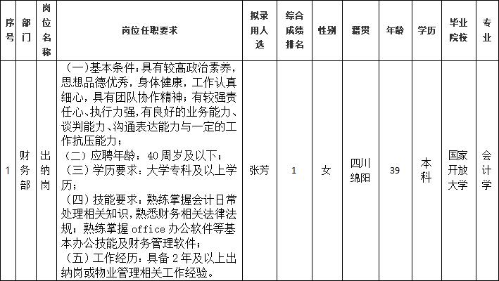 根據(jù)綿陽市康來物業(yè)服務(wù)有限公司發(fā)布的選聘公告及選聘相關(guān)規(guī)定,經(jīng)筆試、面試、背景調(diào)查等程序,擬錄用張芳同志到綿陽市康來物業(yè)服務(wù)有限公司財務(wù)部出納崗工作,現(xiàn)予以公示,具體情況如下: