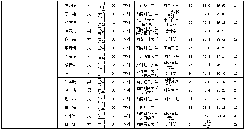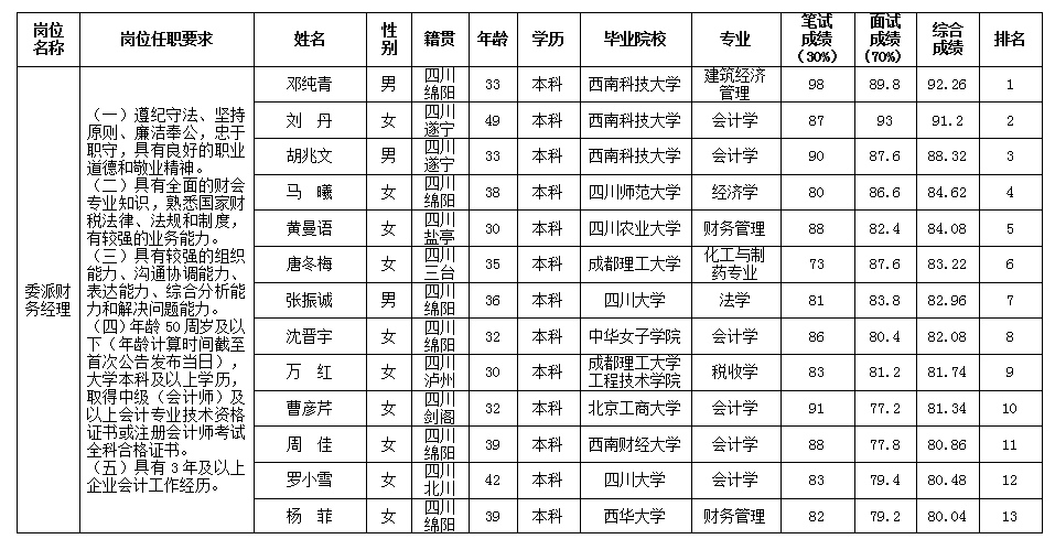 根據(jù)綿陽(yáng)市投資控股(集團(tuán))有限公司發(fā)布的招聘公告及招聘相關(guān)規(guī)定,經(jīng)筆試、面試等程序,現(xiàn)將筆試(面試)成績(jī)予以公示。