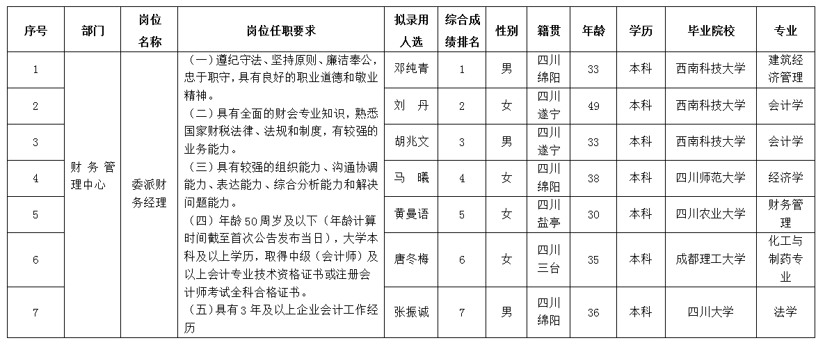 根據(jù)綿陽(yáng)市投資控股(集團(tuán))有限公司發(fā)布的招聘公告及招聘相關(guān)規(guī)定,經(jīng)筆試、面試、考察等程序,擬錄用鄧純青等同志作為集團(tuán)委派財(cái)務(wù)經(jīng)理崗位擬錄用人員,現(xiàn)予以公示,具體情況如下: