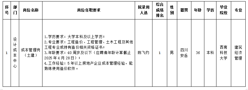 根據(jù)綿陽市綿投置地有限公司發(fā)布的招聘公告及招聘相關規(guī)定,經(jīng)筆試、面試、考察、體檢等程序,擬錄用陳飛灼同志到綿陽市綿投置地有限公司工作,現(xiàn)予以公示,具體情況如下: