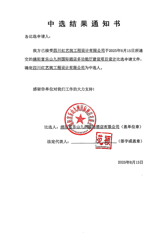 綿陽富樂山九洲國際酒店多功能廳建設項目設計中選結(jié)果通知